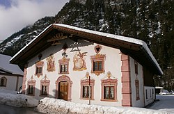 | Diese Datei zeigt das im Tiroler Kunstkataster erwähnte Objekt mit der ID 54186 . ( auf tirisMaps , PDF , weitere Bilder auf Commons , Wikidata ) | Eigenes Werk | Pelz | Datei:Leutasch-Kirchplatzl Armenhaus.jpg |