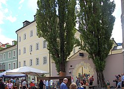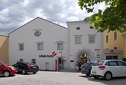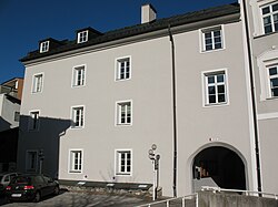 Die Kleine Fronfeste, in bedeutender Lage neben der Liebburg gelegen, ist eines der wenigen Häuser auf dem Hauptplatz, das im Zweiten Weltkrieg nicht durch Bomben zerstört wurde. 1949 wurde das Haus aufgestockt und umgebaut, 1979 wurde neuerlich ausgebaut und modernisiert.[9] Ein breiter stichkappengewölbter Durchgang verbindet Hauptplatz und Europaplatz. Im Gebäude befand sich eine zweigeschoßige Kapelle mit hohen Bogenfenstern, sie war Maria Himmelfahrt geweiht und hatte an der Flachdecke ein Mariengemälde. Mit der Aufhebung des Haller Damenstiftes 1783 und der Übernahme der Liebburg durch den Staat wurde die Kapelle profaniert und ihr Inventar versteigert.[10] | BDA-Hist.: Q37949144 Status: Bescheid Stand der BDA-Liste: 2024-06-15 Name: Kleine Fronfeste GstNr.: 2006 |