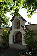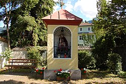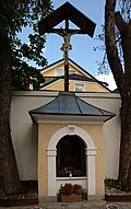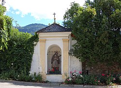 Das Beinhaus, auch Kriegerkapelle oder Kaiser-Karl-Gedächtniskapelle, wurde als kompakter Natursteinbau 1935/1936 in zeittypischen Formen mit abgewalmtem Satteldach errichtet. Neben der überdachten, von einem hölzernen Rundpfeiler gestützten Vorhalle, steht in der Südostecke ein gemauerter Glockenträger mit Doppeladler. Rundbogenportal mit massivem hölzernen Türflügel.[33] Die Kriegerkapelle ist Teil des Soldatenfriedhofs des 1. Weltkriegs. | BDA-Hist.: Q37947867 Status: § 2a Stand der BDA-Liste: 2024-06-15 Name: Ehem. Beinhaus GstNr.: 165/2 |