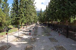 Der Soldatenfriedhof des Ersten Weltkriegs wurde zwischen 1914 und 1915 errichtet und 1916 nach Westen erweitert. 1936 erfolgte eine neuerliche Erweiterung und die Errichtung der Kaiser-Karl-Gedächtniskapelle. Der Friedhof befindet sich hinter einem Portal aus Lärchenholz mit Schmiedeeisentoren. Er beherbergt gleich gestaltete, schmiedeeiserne Grabkreuze und ein Natursteinmonument in Obeliskform. | BDA-Hist.: Q37948478 Status: § 2a Stand der BDA-Liste: 2024-06-15 Name: Soldatenfriedhof des 1. Weltkrieges GstNr.: 165/2 Soldatenfriedhof Erster Weltkrieg, Lienz |