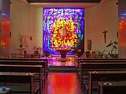 Die Stahlbetonkirche über rechteckigem Grundriss mit abgesetzter Apsis und hohem Chorturm wurde zwischen 1960 und 1963 nach Plänen der Architekten Otto Gruber und Hans Buchrainer aus Lienz an der Südtirolersiedlung errichtet. Das Portal, die Kupferreliefs und die Betonglasfenster wurden 1963 von Jos Pirkner geschaffen.[2] | BDA-Hist.: Q37948266 Status: § 2a Stand der BDA-Liste: 2024-06-15 Name: Kath. Pfarrkirche Hl. Familie GstNr.: 525/7 Pfarrkirche Heilige Familie, Lienz |