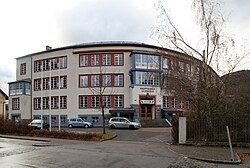 Der große abgerundete dreigeschoßige Bau wurde 1928/29 von Rudolf Frass im Stil der Neuen Sachlichkeit erbaut. Von 1960 bis 1964 die seitlichen Achsen aufgestockt. Die Mittelachse hat einen Portal-Balkon-Vorbau mit Bronzeskulpturen von Wilhelm Frass. | BDA-Hist.: Q37917811 Status: § 2a Stand der BDA-Liste: 2024-06-15 Name: Hauptschule GstNr.: .81 |