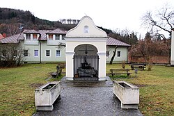Die lebensgroße Gruppe mit Johannes Nepomuk, Engel und Folterknecht wurde 1712 unter Abt Sigismund Braun (1695–1716) von Christoph Brandl als monumentales barockes Brückendenkmal am Brückenkopf der ehemaligen hölzernen Traisenbrücke errichtet. | BDA-Hist.: Q37917791 Status: § 2a Stand der BDA-Liste: 2024-06-15 Name: Figurenbildstock hl. Johannes Nepomuk-Gruppe GstNr.: .59 John of Nepomuk group, Lilienfeld |