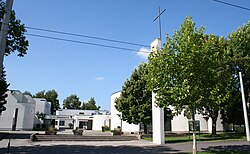 Die Kirche wurde 1965 errichtet. Um einen Vorplatz sind ein freistehender rund 40 Meter hoher Stahlbeton-Turm, der Kirchentrakt und das Pfarrhaus gruppiert. Im Giebelfeld, über dem Portal des Kirchentraktes, befindet sich ein Relief des Bildhauers Walter Ritter. Anmerkung: Im Statistischen Bezirk Neue Heimat |