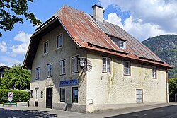 Die Fassade des großen viergeschoßigen Gebäudes stammt aus dem späten 19. Jahrhundert. In der Wappenkartusche ist ein Inschriftstein von 1639 zu sehen, darüber ein schmiedeeisernes, biedermeierliches Hausschild. | BDA-Hist.: Q38019639 Status: Bescheid Stand der BDA-Liste: 2024-06-15 Name: Hotel Bräu GstNr.: .42, .49 Hotel Bräu, Lofer |