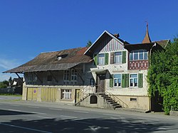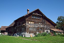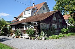 | aus dem DEHIO Vorarlberg 1983: Hofsteigstraße Nr.46 in Lustenau : Hofammannhaus, ehemaliger Wohn- und Amtssitz der Hofammänner von Lustenau. Rheintalhaus, 16.Jh (?), Wohnteil in Blockbauweise über gemauertem Kellersockel, 3geschossig, mit Bretterschirm und Täfer; Klebdächer mit Malereiresten in den Hohlkehlen; gekoppelte Fenster, Zugläden, Rahmungen mit Zahnschnitt. | Eigenes Werk : Quelle: Dehio Vorarlberg | böhringer friedrich | Datei:Hofsteigstraße 46, Lustenau 1.JPG | |