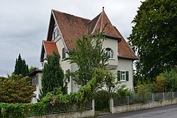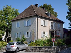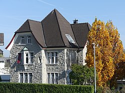 Die Villa im Heimatstil wurde 1907 bis 1910 aus St.-Margrethener Sandstein erbaut. Die lange Bauzeit ergab sich daraus, dass jeder Stein vor Ort zugehauen wurde.[3] | BDA-Hist.: Q38107649 Status: Bescheid Stand der BDA-Liste: 2024-06-15 Name: Villa GstNr.: 1344/5 Dammstraße 1 (Lustenau) |