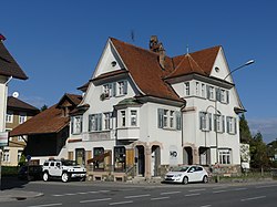 Das Haus mit Kreuzgiebel und Eckturm wurde im Jahr 1910 im Heimatstil erbaut. | BDA-Hist.: Q38107770 Status: Bescheid Stand der BDA-Liste: 2024-06-15 Name: Wohn- und Geschäftshaus mit angebautem Wirtschaftsgebäude GstNr.: 7169 Reichsstraße 58 (Lustenau) |