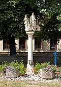 Eine Trinitasgruppe auf einem Vierkantpfeiler mit Schuppenornament; datiert mit 1714. | BDA-Hist.: Q38054050 Status: § 2a Stand der BDA-Liste: 2024-06-15 Name: Pest-/Dreifaltigkeitssäule GstNr.: 4 |