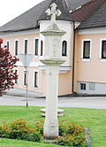 Der Bildstock am Hauptplatz ist ein abgefaster Pfeiler mit Quaderaufsatz und Steinkreuzbekrönung aus dem Jahr 1681. Im Quaderaufsatz sind Reliefs der Kreuzigung und des hl. Sebastian zu sehen. | BDA-Hist.: Q37814228 Status: § 2a Stand der BDA-Liste: 2024-06-15 Name: Bildstock GstNr.: 2093/18 |