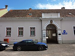 Gebäude mit geglätteter Front, Attika mit Blendbogen und mittigem Schopfwalmgiebel. Fassade 1985 restauriert. | BDA-Hist.: Q37958160 Status: Bescheid Stand der BDA-Liste: 2024-06-15 Name: Bürgerhaus und Teil des römischen Kastells GstNr.: .16 |