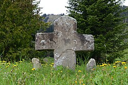 Wuchtiges steinernes Kreuz, ca. 1 m hoch mit 2 Begleitsteinen. Der Legende nach ein Sühnekreuz für einen mehrfachen Brudermord in Bödmen, die Steine nebenbei sind Züüga (‚Zeugen‘ des Verbrechens).[16][17][18] Anmerkung: Zwei weitere dazugehörige Kreuze befanden sich an der Sonnhalde in Bödmen und beim heutigen Café Behringer. Ein sehr beschädigtes Kreuz steht beim Parkplatz der Walmendingerhorn-Bahn.[19] |