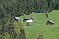 Dieser Vorsäß-Paarhof mit Wohngebäude und frei stehendem Stall wurde im 17. Jahrhundert errichtet. Die zum Tal blickende Giebelfront wurde im 19. Jahrhundert verputzt.[2] | BDA-Hist.: Q37893223 Status: Bescheid Stand der BDA-Liste: 2024-06-15 Name: Bauernhof, Paarhof GstNr.: 1790 |