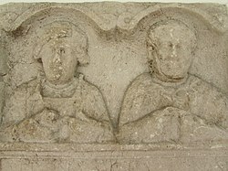 In der Vorhalle der ehemaligen Klosterkirche sind vier römische Grabsteine eingemauert.[12] Der Grabstein von Serenus, Sohn des Claudius Aro, und seiner Frau Praesentina aus Untersberger Marmor stammt aus der Zeit 131–170 n. Chr. und zeigt eine Reliefdarstellung des Paares, der Mann mit einer Rolle in der Hand, die Frau in einheimischer Tracht.[13] Der Grabstein für Lucius Cotinius Martialis, Gemeinderat und Bürgermeister von Iuvavum und seine Frau Peccia Latina ist aus Schaidberger Marmor aus der Zeit 51–150 n. Chr.[14] Der Grabstein für Novellius, Sohn des Opatus und seine Frau Iulia Secundina aus Untersberger Marmor stammt aus der Zeit 1–150 n. Chr.[15] Die vierte Grabplatte ist nur fragmentarisch erhalten. | BDA-Hist.: Q64692104 Status: Bescheid Stand der BDA-Liste: 2024-06-15 Name: Frühmittelalterliche und Römische Befunde Kloster Mondsee GstNr.: 18/1, 18/2 Kloster Mondsee - Roman gravestones |