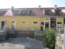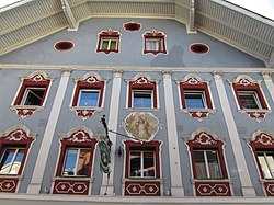 Das Haus besitzt eine bemerkenswerte barocke Fassade mit einem Fresko des hl. Wolfgangs aus der Mitte des 18. Jahrhunderts und einem schmiedeeisernen Wirtsschild.[5] | BDA-Hist.: Q37980461 Status: Bescheid Stand der BDA-Liste: 2024-06-15 Name: Ehem. Gasthaus Zum Schwarzen Adler GstNr.: .77 |