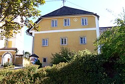 Der Pfarrhof wurde zwischen 1715 und 1735 wahrscheinlich nach Plänen von Jakob Prandtauer als zweigeschoßiger, spätbarocker Bau mit abgetrepptem Walmdach errichtet. Der mit dem Friedhof durch einen ansteigenden Gang verbundene Bau besitzt eine übergiebelte Mittelachse, eine genutete Erdgeschoßfassade und eine Lisenengliederung an den Gebäudeecken und den Längsfronten. | BDA-Hist.: Q37844036 Status: § 2a Stand der BDA-Liste: 2024-06-15 Name: Pfarrhof GstNr.: 1251 |