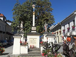 Die Mariensäule in der Mitte des Hauptplatzes wurde anlässlich der Pest 1715 gestiftet. Die Marienstatue steht auf einer Holzsäule, seitlich die Holzstatuen der hll. Rochus und Sebastian auf gemauerten Pfeilern. | BDA-Hist.: Q37767211 Status: § 2a Stand der BDA-Liste: 2024-06-15 Name: Mariensäule GstNr.: .21 Mariensäule Oberwölz |