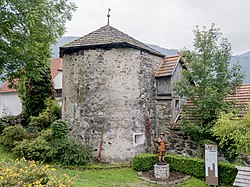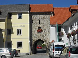 | Hintereggertor (14. Jh.) mit Wappen des Freisinger Bischofs in Oberwölz , Steiermark . Westseite der Stadtmauer, Brücke über den Schöttlbach. | Eigenes Werk | Herzi Pinki | Datei:Hintereggertor Stadtmauer Oberwölz.jpg | |