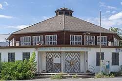 Die zweigeschoßige, achteckige Rinderhalle unter auskragendem Zeltdach, das von einer ebenfalls oktogonalen Laterne mit Zeltdach bekrönt ist, wurde von der oberösterreichischen Holzkonstruktions-Firma Johann Obermayr aus Schwanenstadt und dem Oberwarter Baumeister Gustav Steurer 1952 errichtet.[5] | BDA-Hist.: Q38116222 Status: Bescheid Stand der BDA-Liste: 2024-06-15 Name: Ehem. Rinderversteigerungshalle GstNr.: 1183/3 Rinderversteigerungshalle Oberwart |