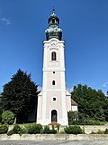 Der kleine Zentralbau über kreuzförmigem Grundriss wurde von 1795 bis 1798 errichtet. Über der westlichen Giebelfassade befindet sich ein Türmchen mit glockenförmigen Helm. Der Hochaltar ist klassizistisch und stammt aus dem Ende des 18. Jahrhunderts.[3] | BDA-Hist.: Q23799272 Status: Bescheid Stand der BDA-Liste: 2024-06-15 Name: Kath. Pfarrkirche, hl. Martin GstNr.: 1 Pfarrkirche St. Martin in der Wart |
