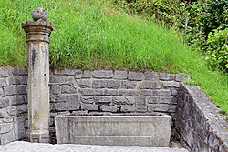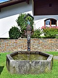 Der Laufbrunnen hat einen rechteckigen, steinernen Brunnentrog mit der Jahreszahl 1907 an der breiten Schauseite. Die seitlich angestellte, achteckige Brunnensäule hat ein profiliertes Kapitell und Jesus- und Marienmonogramm an der Schauseite. Über dem profilierten Kapitell mit Zackenschnittabschluss befindet sich eine Kugel als Bekrönung.[36] | BDA-Hist.: Q37722137 Status: § 2a Stand der BDA-Liste: 2024-06-15 Name: Brunnen GstNr.: 2748/1 Laufbrunnen Kirchweg |