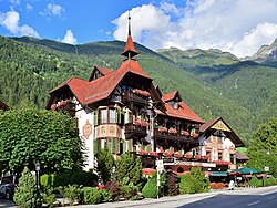 Der Gebäudekomplex aus sieben unterschiedlichen Bauteilen geht im Kern ins 17. Jahrhundert zurück. Der barocke Kernbau wurde vor 1864 erstmals aufgestockt und 1886 um ein weiteres Stockwerk vergrößert. Zwischen etwa 1890 und 1903 entstanden die Holzveranda und der Speisesaal mit überdeckter Holzkonstruktion. Der Anbau mit den zur Hauptstraße orientierten Schauseiten an der Westecke des Gebäudekomplexes stammt aus dem ersten Jahrzehnt des 20. Jahrhunderts. Die Fassaden sind aufwändig mit Erkern, Balkonen und Veranden gestaltet. Die ornamentale und figurale Fassadenmalerei vom Anfang des 20. Jahrhunderts zeigt u. a. allegorische Engelsdarstellungen, den hl. Kassian und Brustbilder der Tiroler Freiheitskämpfer von 1809.[6] | BDA-Hist.: Q37771350 Status: Bescheid Stand der BDA-Liste: 2024-06-15 Name: Posthotel Kassl GstNr.: 1003/2 Posthotel Kassl |