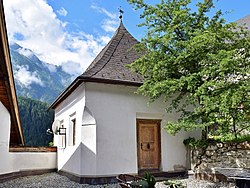 Der Friedhof rund um die Pfarrkirche wurde vermutlich im 16. Jahrhundert angelegt und nach 1950 und um 1990 nach Westen erweitert.[39] Das 1955 errichtete Kriegerdenkmal bestand ursprünglich aus einem halbkreisförmig aufgeführten Quadermauerwerk, darauf befanden sich Kupfertafeln mit den Namen der Gefallenen der beiden Weltkriege, flankiert vom Tiroler Landeswappen und dem Gemeindewappen. In der Mitte stand ein schlichtes Holzbalkenkreuz. 1991 wurde das Denkmal nach einem Entwurf von Norbert Fritz neu gestaltet, wobei das Holzkreuz und die Tafeln mit den Gefallenen wieder verwendet wurden.[40] | BDA-Hist.: Q37721407 Status: § 2a Stand der BDA-Liste: 2024-06-15 Name: Friedhof mit Kriegerdenkmal und Totenkapelle GstNr.: 16 |