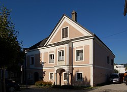 Aus zwei mittelalterlichen Häusern zusammengebaut und 1899 erneuert. Die zweigeschoßige Front besitzt ein Korbbogenportal, die Durchfahrt eine Stichkappentonne. | BDA-Hist.: Q38075846 Status: Bescheid Stand der BDA-Liste: 2024-06-15 Name: Bürgerhaus, Schnürmacherhaus GstNr.: .39 Marktplatz 21 (Ottensheim) |