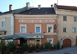 Ende des 16. Jahrhunderts wurden die beiden Häusern zum heutigen Haus verbunden und das Haus wurde in den 1860er Jahren sowie 1899 umgestaltet. Die Fassade hat eine historische Gliederung und im Hof befindet sich ein dreiachsiger Arkadengang. Tonnen-, Stichkappentonnen- und Kreuzgratgewölbe im Inneren. Anmerkung: Identadressen Marktplatz 6, 7 |