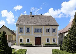 Der traufständige Pfarrhof in der Badgasse wurde 1830 ebenerdig erbaut. Um 1900 erhielt er ein weiteres Stockwerk und eine neue Fassadierung, die allerdings im dritten Viertel des 20. Jahrhunderts wieder geglättet wurde. Im Innenraum sind Räume mit Platzl- und Tonnengewölben zu finden. Der Pfarrhof hat eine Statue hl. Anna Selbdritt in Verwahrung, die wahrscheinlich im zweiten Viertel des 18. Jahrhunderts geschaffen wurde und bis 1966 ihren Platz am Hochaltar der Pfarrkirche hatte. Zu den weiteren Kunstschätzen zählen ein gerahmtes Gnadenbild Maria mit Kind aus der Zeit um 1720, mit Baldachinbekrönung und seitlichem Vorhang, sowie ein Brustbild des Evangelisten Johannes vom Ende des 18. Jahrhunderts. | BDA-Hist.: Q38040140 Status: § 2a Stand der BDA-Liste: 2024-06-15 Name: Pfarrhof GstNr.: 238/1 |