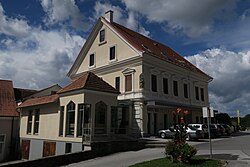 Das Gebäude mit L-förmigem Grundriss hat einen Kern aus 17. Jahrhundert, das Portal ist mit 1827 datiert. | BDA-Hist.: Q38047253 Status: § 2a Stand der BDA-Liste: 2024-06-15 Name: Alter Pfarrhof, Musikschule GstNr.: .1/1 |