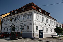 Ehemaliges Brauhaus. Die Bebauung der Stelle ist bereits für 1230/40 urkundlich belegt. Das vorhandene Gebäude stammt aus dem 16. Jahrhundert, ein Stein im Gebäude trägt die Jahreszahl 1574. Im 19. Jahrhundert wurde das Gebäude umgebaut. Der zweigeschoßige kubische Bau mit Rundbogenportal erhielt dabei (1899) sein heute markantes Mansarddach. In der zweiten Hälfte des 20. Jahrhunderts diente das Gebäude als Gasthof, danach als Bank. | BDA-Hist.: Q37847751 Status: Bescheid Stand der BDA-Liste: 2024-06-15 Name: Bürgerhaus, Bankgebäude GstNr.: .57/1 |