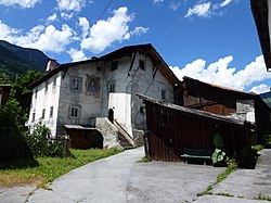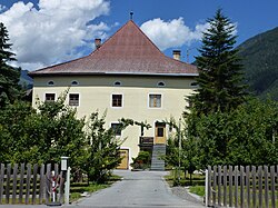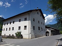 Der Paarhof steht frei im Ortskern von Prutz. Das realgeteilte Wohnhaus stammt im Kern aus der zweiten Hälfte des 14. Jahrhunderts, es wurde im 15. Jahrhundert erweitert und erhielt sein heutiges Aussehen Ende des 16. Jahrhunderts. Ab 2013 wurde es von der Gemeinde als Mehrzweckgebäude mit Veranstaltungszentrum im dazugehörigen Stadel adaptiert. Der zweigeschoßige Mauerbau über hakenförmigem Grundriss weist ein Satteldach und Fluggesperre im Giebel sowie eine stark vorgezogene Giebelfassade auf. Der Eck- bzw. Mittelflur ist über eine Freitreppe erschlossen, darunter befindet sich der Zugang zu den gewölbten Kellern. An der Giebelseite im Obergeschoß befindet sich ein Wandbild Mariahilf aus der 1. Hälfte des 17. Jahrhunderts in einem gemalten, aus Rocaillen, Festons und Putten bestehenden Rahmen, darunter die Reste einer Sonnenuhr in Grisailletechnik von 1674. Das Innere weist aufgrund der Realteilung eine uneinheitliche Raumaufteilung auf. Die frühbarocke Ausstattung stammt von 1674, teilweise haben sich Gewölbe erhalten.[16] Das nördlich anschließende Wirtschaftsgebäude mit Satteldach und Bundwerkgiebel wurde Ende des 16./Anfang des 17. Jahrhunderts errichtet. Über dem gemauerten Stall befindet sich der in Blockbauweise konstruierte, an der Ostseite vorkragende Stadel, dessen Holzkonstruktion Ende des 17. Jahrhunderts vollständig erneuert wurde. Der Stall wurde in der zweiten Hälfte des 19. Jahrhunderts durch Einbau mehrerer Trennmauern verändert.[17] | BDA-Hist.: Q37992533 Status: Bescheid Stand der BDA-Liste: 2024-06-15 Name: Bauernhof, Beim Winkl GstNr.: .32 Prutz - Beim Winkl |