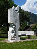 Hohe Skulptur aus Carrara-Marmor mit Pietà und danebenstehendem Opfertisch als Kriegerdenkmal des Bildhauers Engelbert Gitterle aus 1968, Denkmalschutz (1999) | BDA-Hist.: Q38141198 Status: § 2a Stand der BDA-Liste: 2024-06-15 Name: Kriegerdenkmal GstNr.: 1 |