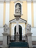 Pietà – Mariensäule vor dem Hauptportal der katholischen Pfarrkirche Rechnitz. Die Säule zeigt ein Standbild der „schmerzhaften Mutter“, umgeben von vier Engelfiguren auf Pfeilern, die ein schmiedeeisernes Gitter verbindet. Auf breiter Deckplatte befindet sich die Steinfigur der Muttergottes mit dem Leichnam Christi im Schoß. Die Säule wurde von der Familie Batthyány in den Jahren 1710/11 aus Dankbarkeit für das Erlöschen der Pest errichtet. Da die Säule durch einen starken Sturm arg beschädigt worden war, wurde sie am 1. Juli 1793 restauriert wieder aufgestellt. |