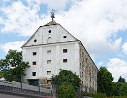 Der Schüttkasten hat vier Geschoße und ein Krüppelwalmdach. An der Nordfront zeigt der ehemalige Getreidespeicher das Wappen der Familie Batthyány. | BDA-Hist.: Q2259937 Status: Bescheid Stand der BDA-Liste: 2024-06-15 Name: Ehem. Granarium GstNr.: 1597/2, 1569, 1596 Granarium Rechnitz |