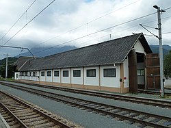 Das 1905 errichtete Nebengebäude des Bahnhofs wurde um 2011/2012 im Zuge der Bahnhofsneugestaltung abgetragen.[4] | BDA-Hist.: Q38176694 Status: Bescheid Stand der BDA-Liste: 2024-06-15 Name: Außerfernbahn – Bahnhof Reutte, Nebengebäude GstNr.: .474, .476 Bahnhof Reutte in Tirol |