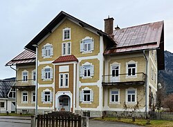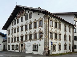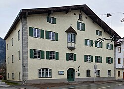 Das kleine rechteckige, zweigeschoßige Gebäude hat ein Pfettendach und an der Giebelfassade ein Fresko „Schützen mit Wappen Kaiser Franz Joseph I.“[32] | BDA-Hist.: Q38114740 Status: § 2a Stand der BDA-Liste: 2024-06-15 Name: Wandmalerei, Wohnhaus GstNr.: .62/1 |