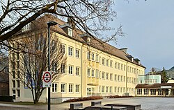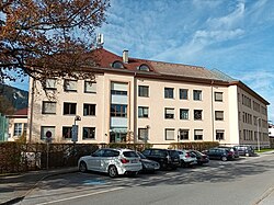 Das Schulgebäude wurde 1950 bis 1952 erbaut, das Sgraffito an der Westfassade mit einer Ansicht von Ehrenberg stammt von Walter Honeder.[35] | BDA-Hist.: Q38114760 Status: § 2a Stand der BDA-Liste: 2024-06-15 Name: Hauptschule Untermarkt, Sgraffito GstNr.: 81/1 |