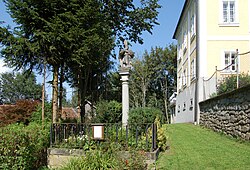 Das Standbild des Heiligen Nikolaus besteht aus einer toskanischen Säule und einer darauf thronenden Figur des Heiligen Nikolaus. Die Figur wurde vermutlich um 1730 geschaffen. | BDA-Hist.: Q37840651 Status: § 2a Stand der BDA-Liste: 2024-06-15 Name: Standbild hl. Nikolaus GstNr.: 52 Säule heiliger Nikolaus (Berg bei Rohrbach) |