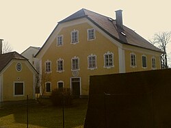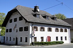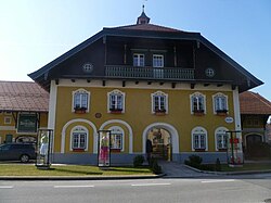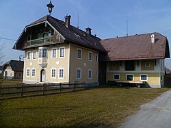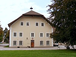 Das zweigeschoßige Mittelflurhaus mit schindelgedecktem Schopfwalmdach ist über dem Portal mit 1652 bezeichnet. | BDA-Hist.: Q38055330 Status: § 2a Stand der BDA-Liste: 2024-06-15 Name: ehem. Mesnerhaus GstNr.: 350 |