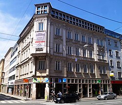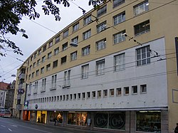 Das 1926 erbaute Gebäude war ursprünglich ein Druck- und Verlagshaus. Es wurde von Wunibald Deininger errichtet und nach der Schließung des Verlags 1987 bis 1989 von Wilhelm Holzbauer umgestaltet. Das Gebäude beherbergt heute unter anderem ein kleines Einkaufszentrum. | BDA-Hist.: Q14912625 Status: Bescheid Stand der BDA-Liste: 2024-06-15 Name: Ehem. Druckerei Kiesel GstNr.: 1248/5 Kiesel-Gebäude |