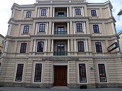 Das ursprüngliche Faberhaus, ein U-förmiger historistischer Gebäudekomplex aus der Gründerzeit, entstand nach Abriss der Lodronschen Befestigungsanlagen nördlich des Mirabellplatzes in der 2. Hälfte des 19. Jahrhunderts. Das Faberhaus ist benannt nach dem Wiener Brauereidirektor und Auftraggeber Moritz Faber und umfasst die Adressen Rainerstraße 2, Hubert-Sattler-Gasse 1 und 3 sowie Franz-Josef-Straße 2 und 4.[2] Entworfen wurde der Bau von Franz Schommleitner und errichtet von Valentin Ceconi. Mittlerweile werden auch ähnlich und ebenfalls von Ceconi errichtete anschließende Gebäude als Faberhäuser bezeichnet, besonders die den Häuserblock um Rainerstraße, Hubert-Sattler-Gasse, Faberstraße, Franz-Josef-Straße bilden. Teile des Komplexes wurden im Zweiten Weltkrieg beschädigt. Heute sind im Haus Rainerstraße 2 eine Bank, in den anderen Gebäuden unter anderem Einrichtungen des Magistrats Salzburg untergebracht. Das Haus an der Ecke Rainerstraße/Franz-Josef-Straße wird auch Palais Faber genannt, beim Umbau des darin befindlichen Hotels wurden hinter einer Gipskartonverkleidung im Eingangsfoyer Reste der prunkvollen Ausstattung aus der Erbauungszeit (um 1874) gefunden. Auf Grundlage dieser Reste, die ca. 30 % des Gesamtbestandes ausmachten, wurde das Foyer vollständig rekonstruiert, auch die Bemalung in bunter, glänzender Marmoroptik wird in einem Teil nachgestaltet.[3] | BDA-Hist.: Q37971580 Status: Bescheid Stand der BDA-Liste: 2024-06-15 Name: Bürgerhaus, Teil der sog. Faberhäuser GstNr.: 1057 Rainerstraße 2, Salzburg |