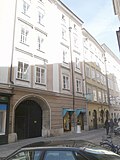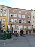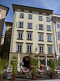 Das sechsgeschoßige Bürgerhaus geht in seiner Bausubstanz auf das 16. Jahrhundert zurück, es hat ein Walmdach und einen langgestreckten, zweigeschoßigen Anbau. Die Fassaden im Plattenstil haben zwei Korbbogenportale mit Volutenaufsatz und stammen aus der Zeit um 1800. Anmerkung: Das jetzige Café auf Mozartplatz 2 steht nicht unter Denkmalschutz. |