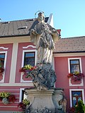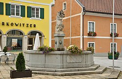Der steinerne 8-eckige Brunnen mit Wappentier und Kettenfreiheit steht in der Mitte des Marktplatzes. Er wurde 1907 im Zuge des Hochquellenleitungsbau erneuert und in mit verschiedenen Inschriften bezeichnet.[4] | BDA-Hist.: Q38181799 Status: § 2a Stand der BDA-Liste: 2024-06-15 Name: Brunnen GstNr.: 318/1 |