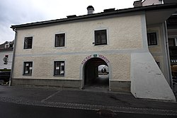 Das ehemalige Tor der Stadtbefestigung erhielt 1930 einen Nebendurchgang mit Kapelle.[3] | BDA-Hist.: Q37726155 Status: § 2a Stand der BDA-Liste: 2024-06-15 Name: Ehem. Salzburger Tor GstNr.: 575/3 Salzburger Tor, Schladming |