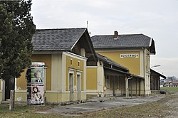 | Aufnahmsgebäude, Toilettenhäuschen und Gütermagazin