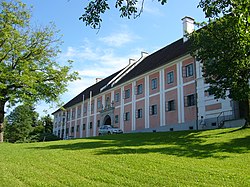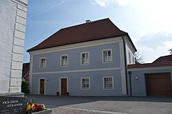 Ein gewaltiger tiefrechteckiger zweigeschoßiger Vierkanter, der nach einem Entwurfsplan von Mathias Gerl in den Jahren 1769 bis 1775 erbaut und nach Bränden in den Jahren 1836, 1844 und 1852 zeitstilgemäß wieder aufgebaut wurde.[2] | BDA-Hist.: Q37941986 Status: § 2a Stand der BDA-Liste: 2024-06-15 Name: Gutshof/Meierhof GstNr.: 37/2 |