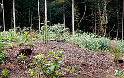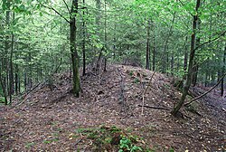 | Grabhügel im Gebiet der Grabhügelgruppe in Pichling, Gemeinde Georgsberg bei Stainz, Steiermark, Österreich. Die Grabhügel werden in die römische Kaiserzeit datiert, sie wurden im 19. Jahrhundert erstmals untersucht und stehen unter Denkmalschutz (Funde wurden an das Joanneum in Graz übermittelt). Im Gelände sind keine Details erkennbar, die Stelle ist (Stand September 2013) mit Bäumen oder dichtem Gebüsch verwachsen. | Eigenes Werk | Josef Moser | Datei:Georgsberg, Gelände der Grabhügelgruppe Pletterer-Nord10.jpg |