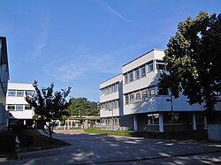 1967–1974 nach Entwürfen von Heribert Komlanz, Hedy und Michael Wachberger erbautes Berufsschulzentrum, bestehend aus kaufmännischer und gewerblicher Berufsschule, Werkstätten, Internat und Küchengebäude mit Speisesaal. Im Zentrum der Anlage befindet sich ein großer rechteckiger Hof. Der Hof wird außen von einem gedeckten Gang, eckige Betonsäulen die ein Flachdach stützen, umfangen. Von diesem zentralen Gang werden die einzelnen ein- bis viergeschoßigen solitären Gebäudeteile des Schulkomplexes erschlossen. Die einzelnen Gebäude mit unregelmäßiger Grundfläche schließen mit Flachdächern ab. Die Obergeschoße ruhen z. T. auf Stützen, die Belichtung erfolgt durch horizontale Fensterbänder. | BDA-Hist.: Q37811643 Status: § 2a Stand der BDA-Liste: 2024-06-15 Name: Berufsschulzentrum GstNr.: 357/6 |
